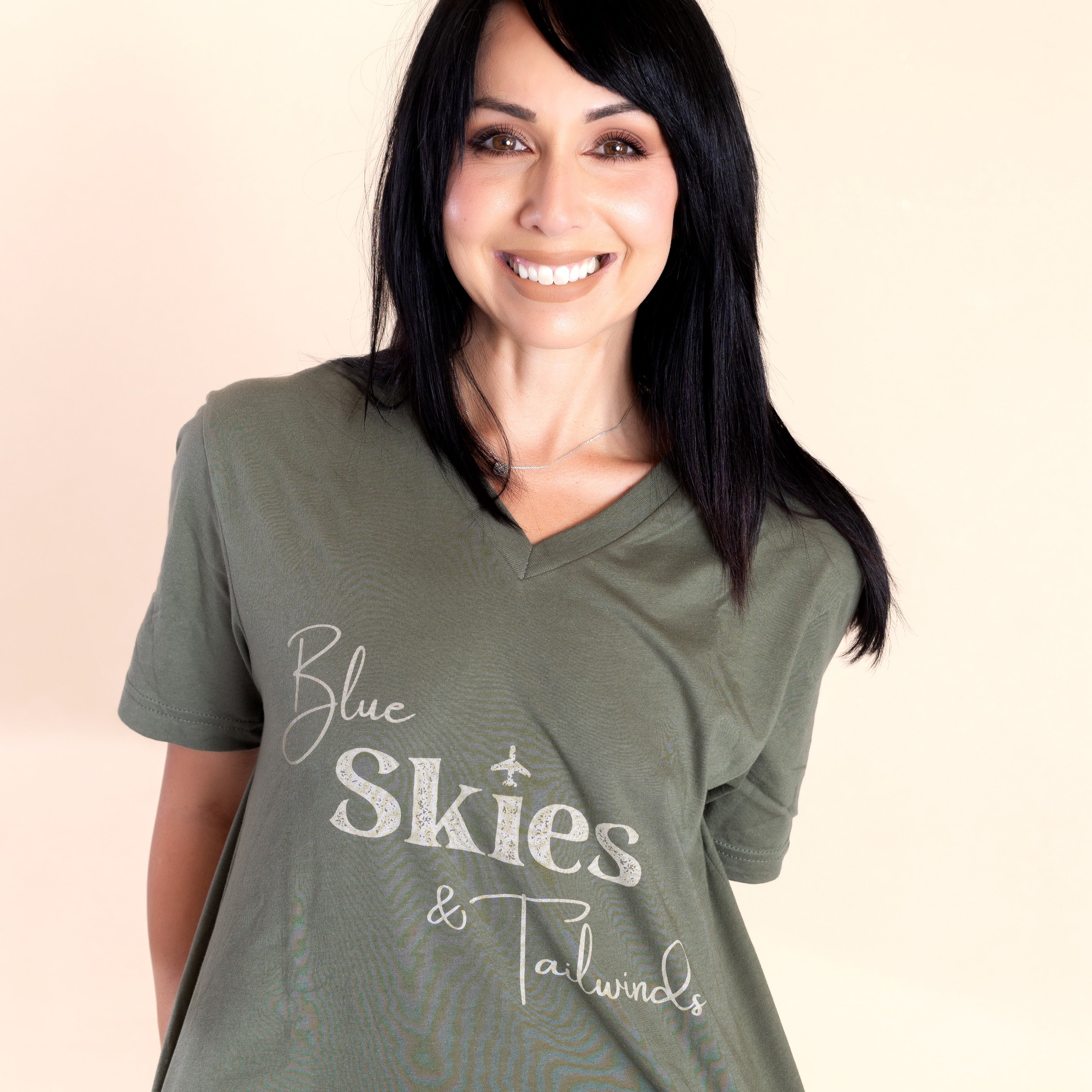 Blue Skies and Tailwinds is printed on the front, comfortable and easy to wear, this tee fits perfectly into your everyday wardrobe. Pair it with your favorite joggers, jeans, or travel-day leggings for a look that’s as comfortable as it is meaningful.
