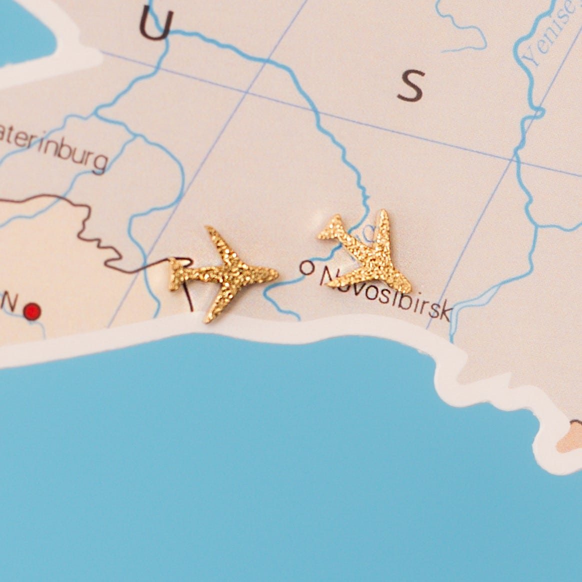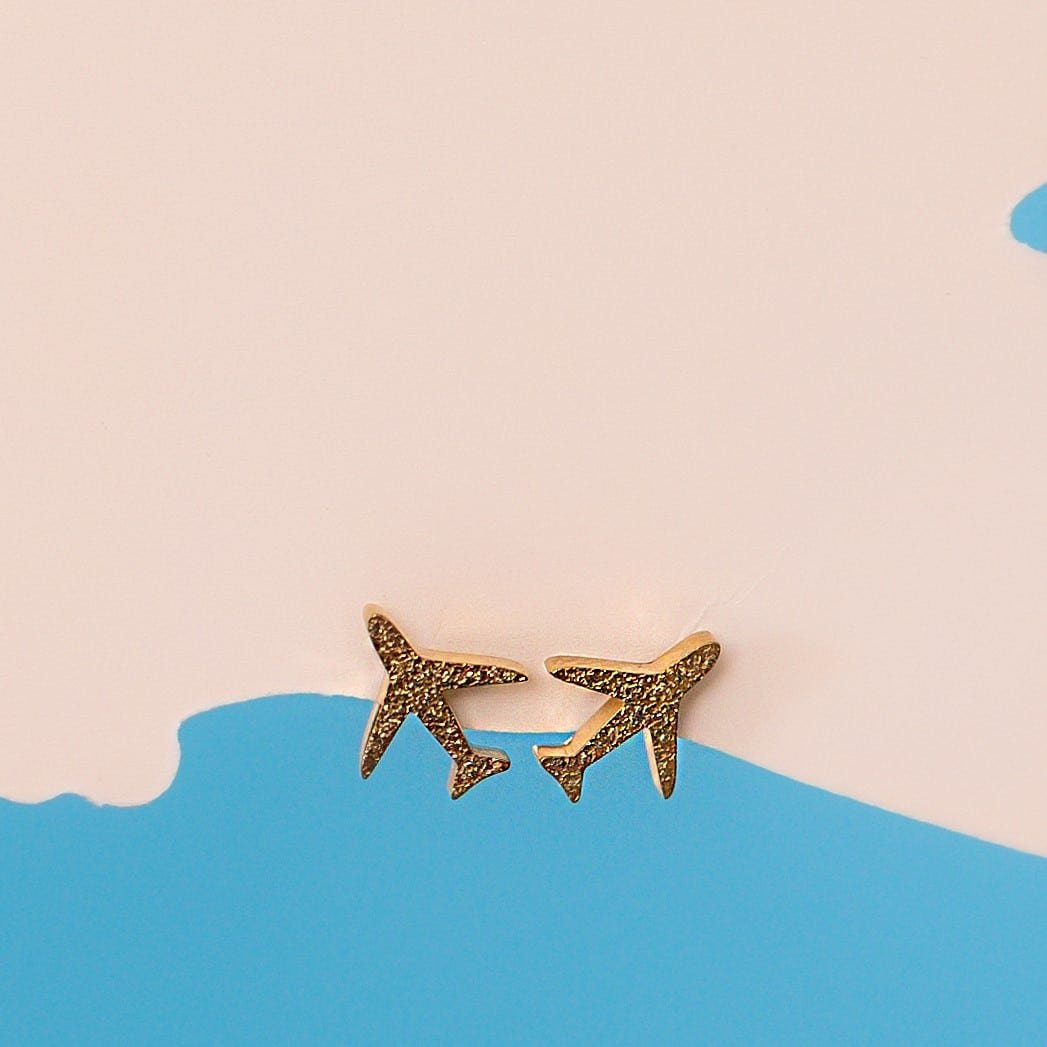 Each pair features a delicate frosted finish over gold plating and a minimalist airplane silhouette that celebrates strength, adventure, and freedom. Thoughtfully packaged in a charming round blue gift box, they make the perfect keepsake or ready-to-gift treasure for any aviation enthusiast.