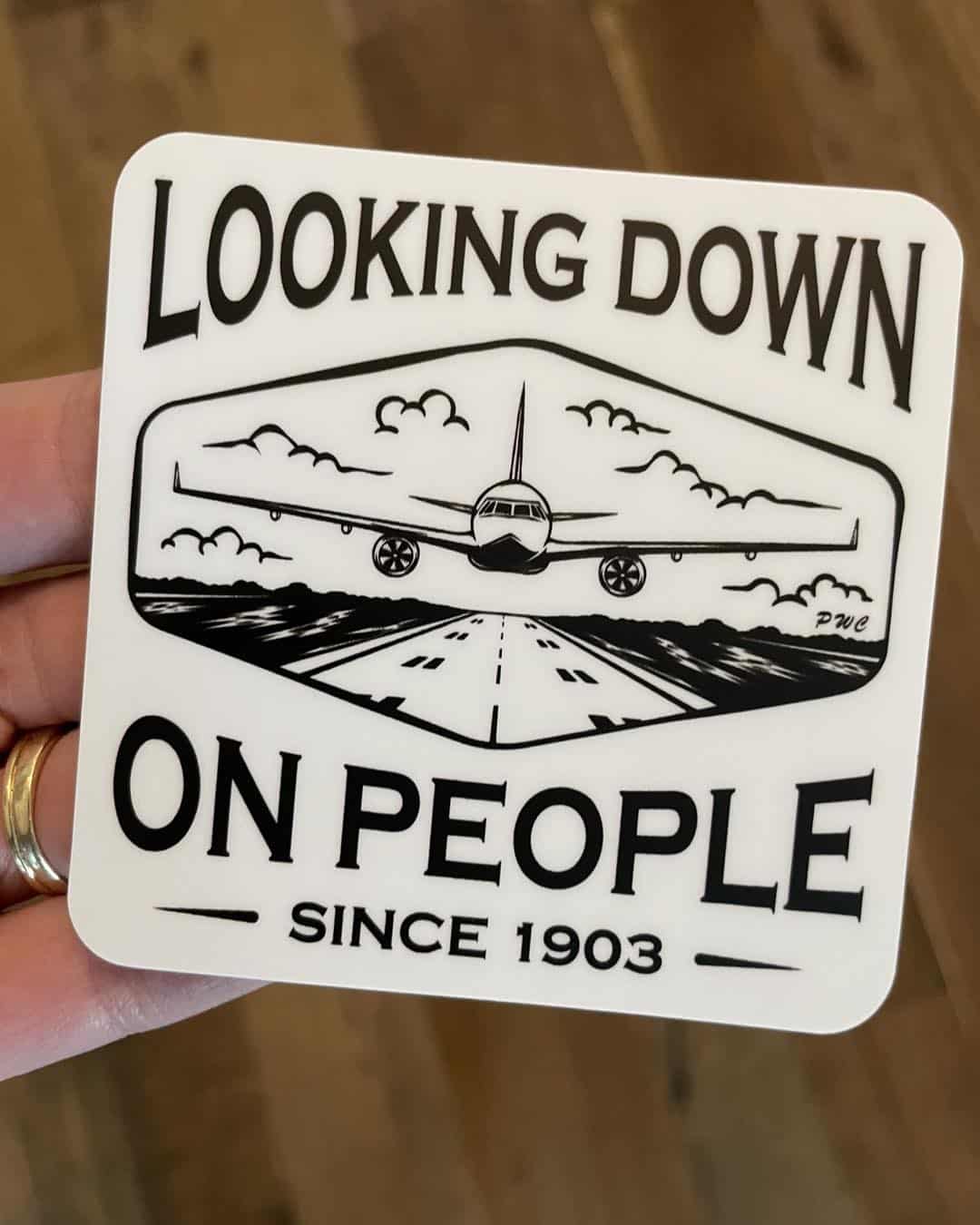 The sticker features a hand drawn illustration of an airplane, soaring through the clouds with the clever caption “Looking down on people since 1903”, a playful nod to the Wright Brothers’ historic first flight.