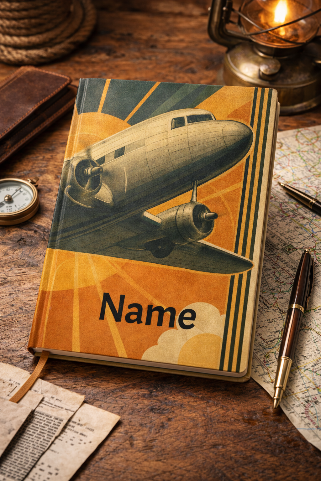 A vintage-inspired hardcover journal that brings the golden age of flight to your daily notes. The matte laminated cover shows a stylized propeller airplane against warm sunburst rays and muted retro hues, wrapping the artwork fully around the book. Inside, 150 lined pages with perforations and a flexible sewn spine make this journal both durable and easy to use — tear out a page when you need to pass along a sketch or idea. The nostalgic feel is a great way to capture travel logs, sketching, planning, or letter-writing. A small production barcode appears on the back cover.