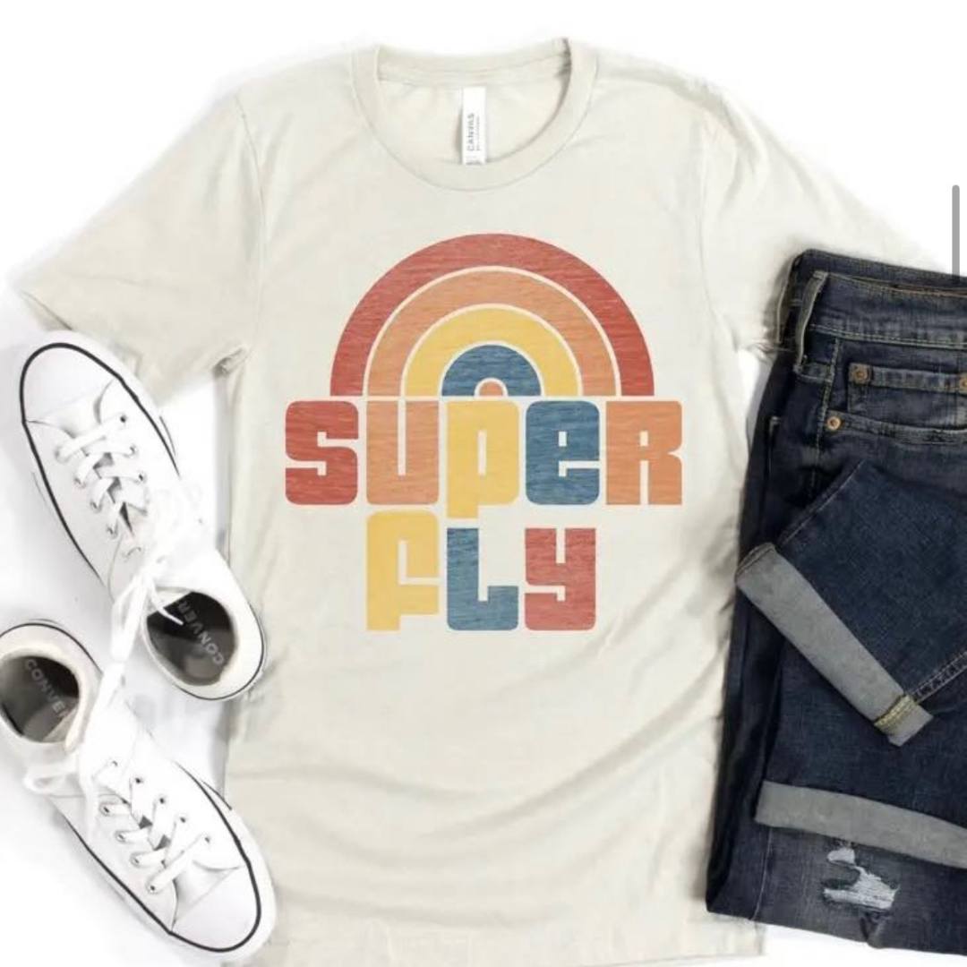A Super Fly T-shirt for a super fly guy or fly girl! Multi-color artwork printed on Bella+Canvas cement colored tshirt.